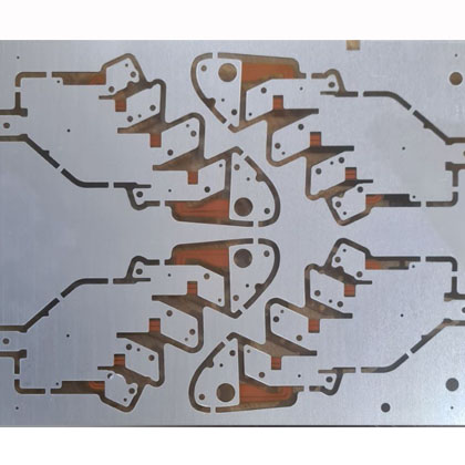 鋁基散熱側方位白天行車燈柔性線路板,即汽車側方位日間行車提示(或警示)LED信號燈的基板,汽車日間燈需要長期處于點亮狀態,電量功耗較大,采用單層大面積鋪銅設計,背面貼裝壓合特定厚度的鋁基散熱片,有效保障能量轉換過程中的電熱分離;控制電路增加了LED燈的顯示效果與狀態監測設計,有效確保日間行車LED燈的智能化升級;相對復雜的外形結構設計,引發此柔性線路基板的壓合加工與成型加工有一定難度。